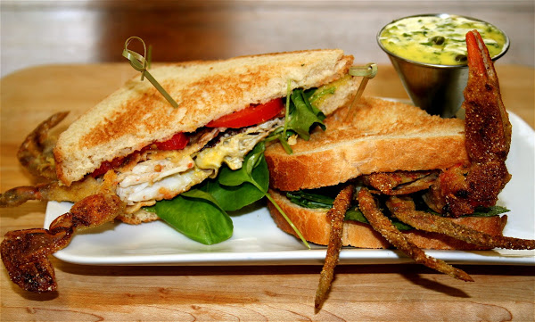 Meanwhile toast the bread. Spread the lemon-caper aioli on four of the slices, top with a handful of watercress and a tomato slice. Top each with a soft shell crab, and finally the top slice of bread. Serve with more aioli or lemon on the side.