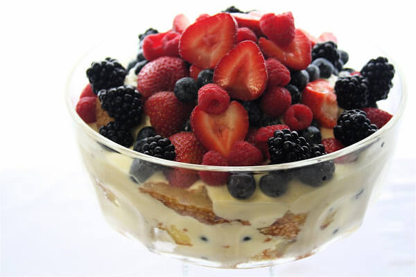 2. Line the bottom of a bowl (ideally a clear glass bowl with straight sides) with cake. Sprinkle with Grand Marnier. Top with 1/3 of the fruit mixture. Top with half of the custard. Layer more cake on top. Sprinkle with Grand Marnier, top with 1/3 of the berries and the rest of the custard. If more cake remains, layer it on top, sprinkle with Grand Marnier and top with the rest of the berries.