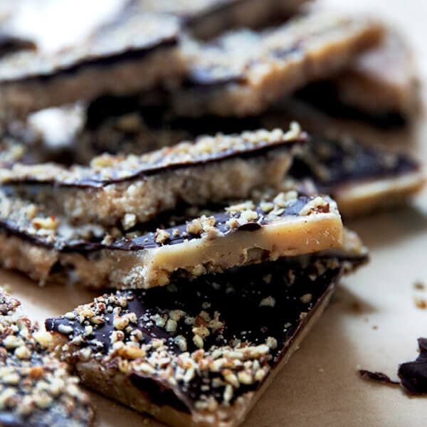 Chocolate: I’ve used both semi-sweet (46% cacao) and dark chocolate (74% cacao), and I like both. Obviously, when semi-sweet chocolate is used, the toffee comes out sweeter.
