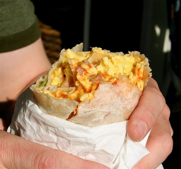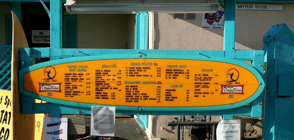This morning, we pulled into the San Clemente Pipes Cafe location, smiled at the “No Shoes, No Shirt, No Problem” welcome sign, and ordered our breakfast. We sat outside — why wouldn’t we sit outside in January? — sipped our coffee and waited for our food, a breakfast burrito filled with scrambled eggs, cilantro, green chile, cheese and pica sauce rolled in a flour tortilla, for me, and a breakfast burrito filled with eggs, ham, bell pepper, onion, cheese and pica sauce, for Ben. When these massive wraps arrived, we tucked in. If the breakfast concoctions at Kono’s even resemble the fare we savored this morning, we’re in for a real treat. Thanks Chu!