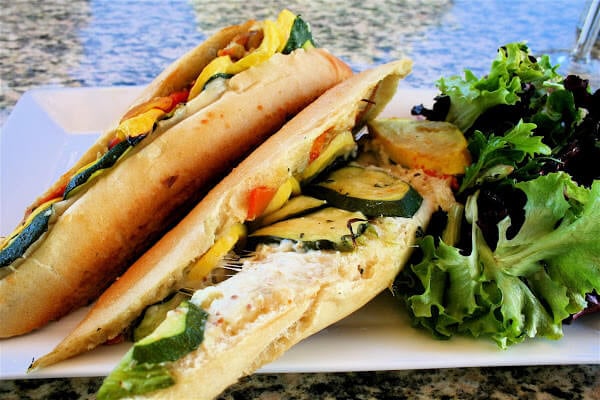 Anyway, lunch at Café Mimosa proved the perfect antidote to my near heart attack on Avenida Del Mar outside the library. I could barely see straight, let alone read, so I ordered the first sandwich I saw, a vegetarian panini. One bite into this pressed sandwich, spread with artichoke tapenade, filled with perfectly roasted — al dente — vegetables and melted with Asiago cheese, and I felt my nerves calm, the customer service man who suggested I switch to on-line bill pay, a distant memory.