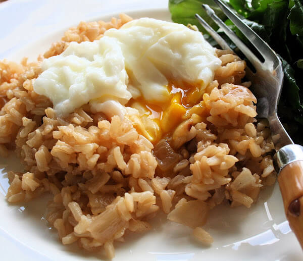 Note: This recipe gives instructions to make brown rice pilaf, but any kind of rice — steamed jasmine or basmati, Uncle Ben’s long-grain converted, or minute rice — makes a wonderful base for a poached egg. Polenta works as well. Serve some sautéed greens aside this poached egg-rice combination for a simple dinner.