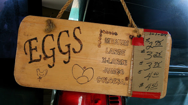 I have no doubt that these eggs look — the yolks, as the picture below shows, are a rich, orange color — and taste the way they do because Don treats his chickens so well. Last Sunday, I asked Don what kind of laying hens he raises, and he pulled out a picture he keeps in his cash register. He has some Sextons, but most of his hens are a cross between a Rhode Island Red and a white breed, (the name of which I have forgotten).