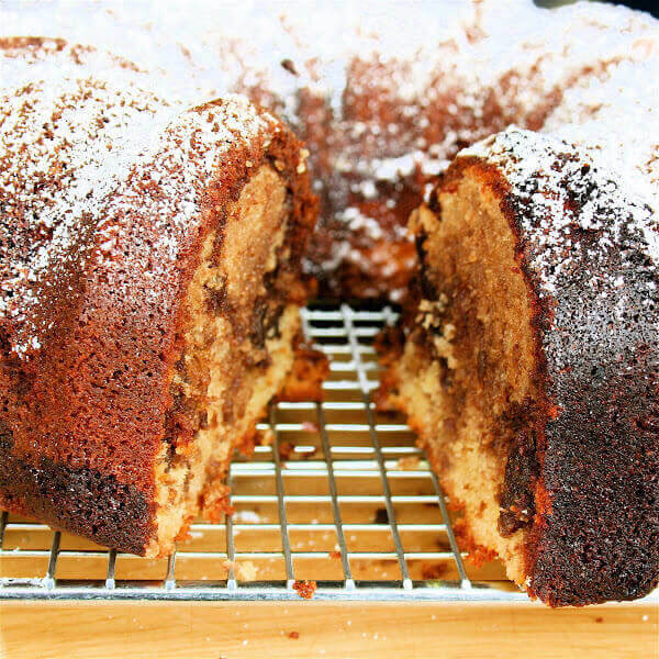 Whisk the chocolate syrup with another third of batter, then pour this into the bundt pan. Pour the remaining third of batter over this, lightly swirl the batters with a wooden skewer or knife to give a “marble” effect and place the pan in the oven.
