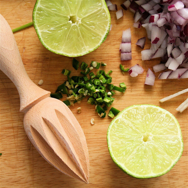 - Using a mandoline, julienne the jicama to yield about 2 cups. Place in a large bowl. Julienne the mangoes (to yield about 2 cups as well) and add to the bowl. (Alternatively, just dice the fruit.) Add the onions, peppers and cilantro to the bowl. Season with a big pinch of salt. Juice one lime over top of the mixture. (A reemer is a great tool for this step.) Toss gently, then taste. Adjust with more lime juice or salt. Set aside until ready to serve. Note: Can be made ahead, but not too far ahead — no more than an hour is ideal.