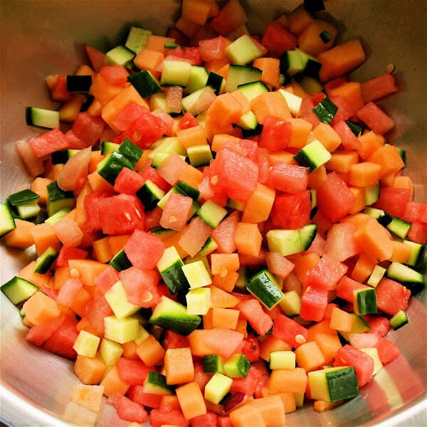 • 23 cups mixed honeydew, cantaloupe, and watermelon, peeled, seeded, and diced