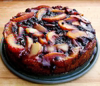 We’ve received some letters from readers complaining about a burned crust when making the peach blueberry cake, so we ran through the recipe two more times. Baked in a standard light-colored metal pan, the cake was perfect; baked in a dark metal pan, however, it burned — be aware that the cake’s high sugar content makes it more susceptible to burning at high heat.