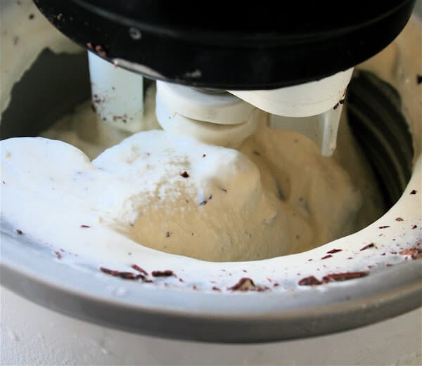 - Chill the mixture until completely cold. Churn in an ice cream maker. During the last few minutes of churning, add the chocolate chips. Freeze mixture until ready to serve.