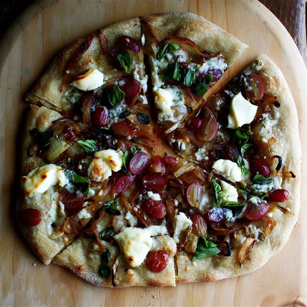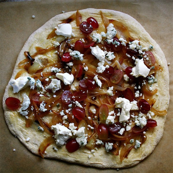 I am resolved. I am resolved never to make another recipe for pizza dough. Seriously. This is it. My family has been making this recipe for years and it is incredibly delicious. Tried and True. Foolproof. No tweaking necessary. Caramelized onions, grapes (or figs), gorgonzola and mascapone (or some other creamy cheese like ricotta) is one of our favorite combinations.