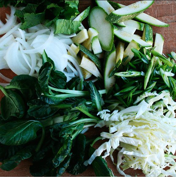 - Chop all of your ingredients. The stir-fry takes five minutes of cooking once all the veggies are prepared, so it’s best to have everything chopped ahead of time. This is what I used: onion, cabbage, baby bok choy, rapini, cilantro, snow peas, zucchini, scallions, tofu and peanuts. Be sure to wash the bok choy.