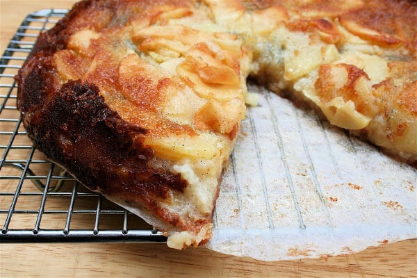 Why? Because Bolzano apple cake is more like a cross between a clafouti and a pancake. After the cake is removed from the oven, it falls, and the slices of vanilla-seed speckled apples meld together sinking into the tiniest of tiny layers of custardy cake. It is delectable.