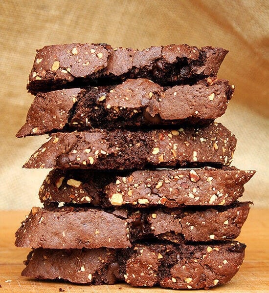 * Lebovitz bakes his for 20 to 30 minutes during the second baking. I like my biscotti not too crisp and have found good results with just 15 minutes of baking second time around. Also, really make sure your oven is at 350º or less — the chocolate will burn if your oven is hotter.