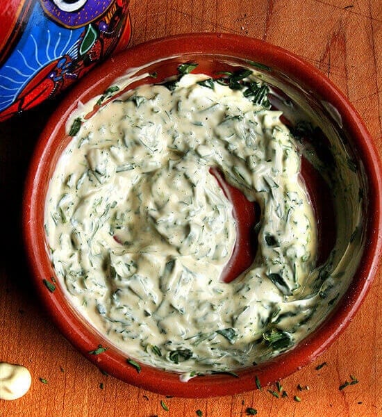- Start beating vigorously while slowly drizzling in the olive oil. Beat until thick and smooth.
