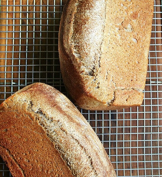Bake loaves for 45 minutes. Turn loaves out onto cooling rack. If you can refrain, let cool for at least 20 minutes before cutting.