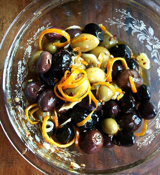 - Place olives in a bowl. Pour marinade over top. Let sit for at least one hour (if possible) at room temperature before serving or storing. Bring olives to room temperature before serving.