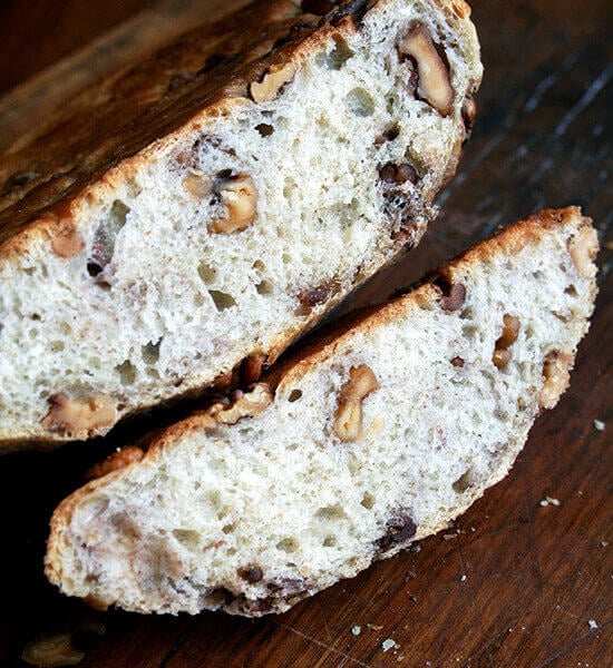 - I really like baking this bread in a preheated Dutch oven. If you don’t have one, you can bake the loaves in buttered pyrex bowls or just free form on a baking sheet, but just know that the crust won’t be thick and crispy. Also, I prefer to make one large loaf versus splitting the dough in half — I just think it bakes better and tastes better — but if you don’t have a straight-sided Dutch oven, as I do not, this can be a pain. As much of a pain as it is, until I get a proper pan, I will continue to bake it in this Dutch oven even though it means I have to crush it a little bit when I remove it.