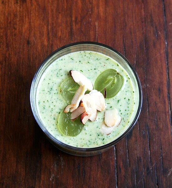 - In a food processor, chop the garlic and 1/4 cup of the almonds until very fine. Add the breadcrumbs and cream cheese and process until well blended. Add the cucumber, scallions, dill, milk, vinegar, and the grapes from the freezer. Process until puréed as finely as possible, 1 to 2 minutes. With the machine running, pour in the oil. Taste and season with salt and pepper. I ended up adding a teaspoon of kosher salt and an extra tablespoon of white balsamic vinegar. Chill until ready to serve.