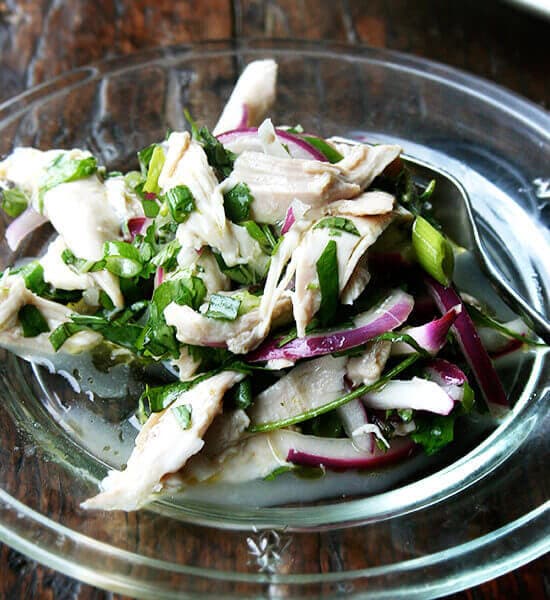- Meanwhile pull chicken from bones and place in a large mixing bowl. Slice the scallions somewhat thinly (or not) and add to the bowl. Give the herbs a rough chop and add to the bowl. Add the macerated red onions and the ¼ cup of olive oil. Season with ½ teaspoon kosher salt and freshly cracked pepper to taste. Add pepper flakes or chili to taste.