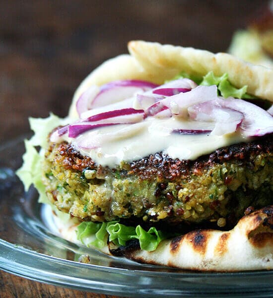 *Quinoa: This is how I cook quinoa: Bring a pot of water to a boil. Once the water comes to a boil, add the quinoa and cook for 9 minutes. Drain. There is no need to salt the water here because the mixture is seasoned sufficiently (but otherwise I would salt the water). For these burgers, I have been cooking a cup of quinoa at a time, which produces over 2 cups of cooked quinoa, and I use 1 cup here and the rest for a salad. But if you want to try to produce a single cup of quinoa, try starting with about ⅓ cup (66 g) of dried quinoa. It won’t be perfect, but it will be close. The weights below for the vegetables (onions, scallions, herbs, zucchini) are rough — use them as a guide. Try to stay somewhat close but don’t worry about completely matching. You can use any spices you like. Cumin is common, but I find it to be overpowering. Smoked paprika offers a nice smokiness and a nice change if you are looking for one.