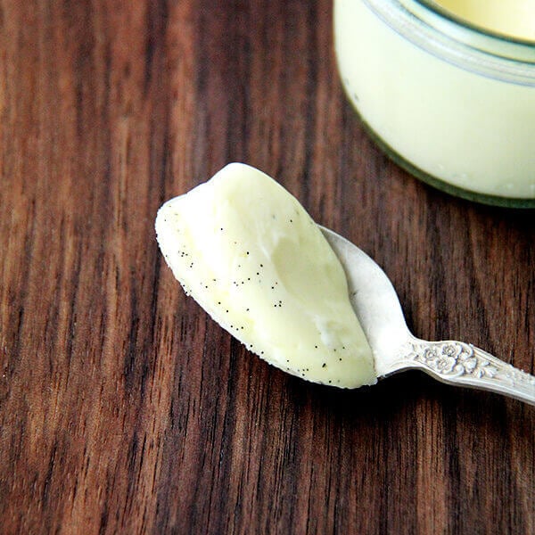 - Combine cream, milk, and 5 tablespoons (1/4 cup + 1 tablespoon) of the sugar. Split the vanilla bean in half lengthwise, scrape the vanilla seeds into the cream, and drop in the empty pod as well. Heat mixture until it’s hot to touch and sugar has dissolved, then remove the pan from the heat, cover, and let it steep for an hour (if possible).