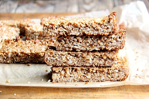 Line a 8×8-inch or 9×9-inch pan with parchment paper overhanging the edge a bit. Transfer mixture to pan and spread to fill. Bake for 20 to 25 minutes or until the edges begin to brown. Remove pan from oven and let cool for 20 minutes. Remove block of bars by pulling up on parchment paper and transfer to cutting board. Cut into desired shape. Store at room temperature in a ziplock bag or tupperware.