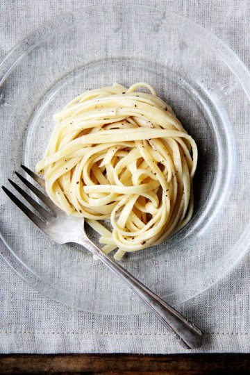 Cacio e pepe, a classic Italian dish, relies on starchy pasta cooking water to form a creamy emulsion with butter and cheese, often Parmigiano Reggiano and Pecorino Romano, and it couldn’t be more delicious or simple. I like simple right now.