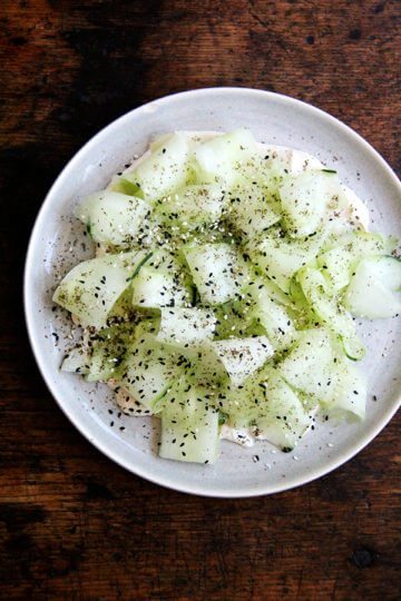 - Smear a plate with 1/4 cup of the sauce (or more—see photo for reference). Top with the wilted, ribbony cucumber slices. Season as you wish with za’atar, sesame seeds, sea salt, or all three.