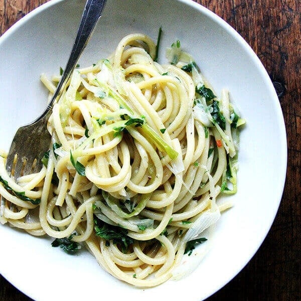 - Combine leeks, pasta, garlic, 1/4 teaspoon red pepper flakes (or more if you like heat), oil, 2 teaspoons kosher salt, pepper to taste, and water in a large straight-sided skillet (the bucatini should nearly lay flat).