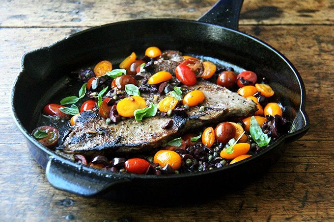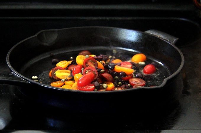 Here, while the skirt steak rests, you’ll make a simple sauce Niçoise. After halving cherry tomatoes, coarsely chopping olives, and tossing the two with capers, you’ll briefly sauté the mix with olive oil and garlic. After just a few minutes, the tomatoes will begin to break down, releasing juices and sweetening as they soften. A squeeze of fresh lemon juice at the end offers a welcomed hit of acidity.