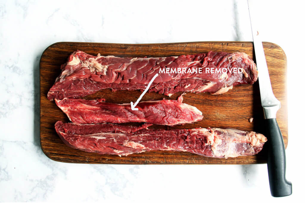 - If you find it and it arrives as pictured above in the video, you need to remove the membrane running down its center — ask the butcher to do this for you or watch the video above for guidance. Ideally, you’ll want to butterfly the remaining loins, too, to ensure fast, even cooking.