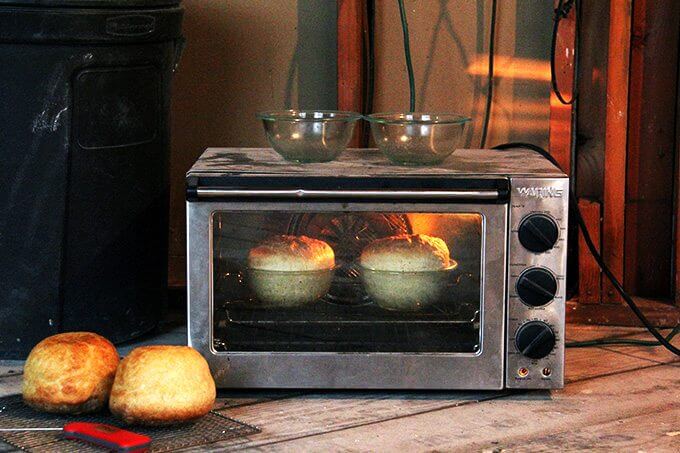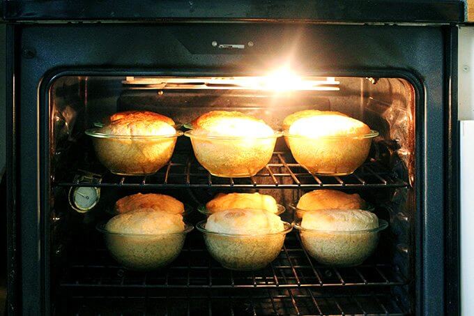 - Transfer the bowls to the oven and bake for 15 minutes. Reduce the heat to 375°F and bake for 17 to 20 minutes more, until evenly golden all around. Remove the bowls from the oven and turn the loaves out onto cooling racks. If the loaves look pale, return them to their bowls and bake for 5 minutes longer. Let the loaves cool for 15 minutes before cutting.