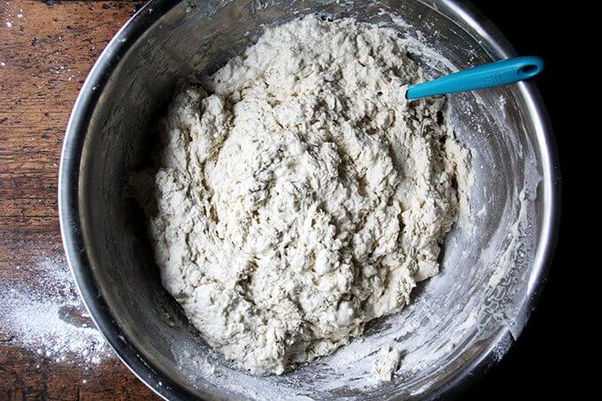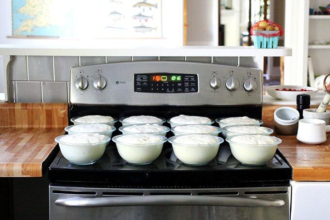 - Set a rack in the middle of the oven and preheat it to 425°F. Grease two 1-quart oven-safe bowls with the softened butter—be generous. Using two forks, deflate the dough by releasing it from the sides of the bowl and pulling it toward the center. Rotate the bowl quarter turns as you deflate, turning the mass into a rough ball.