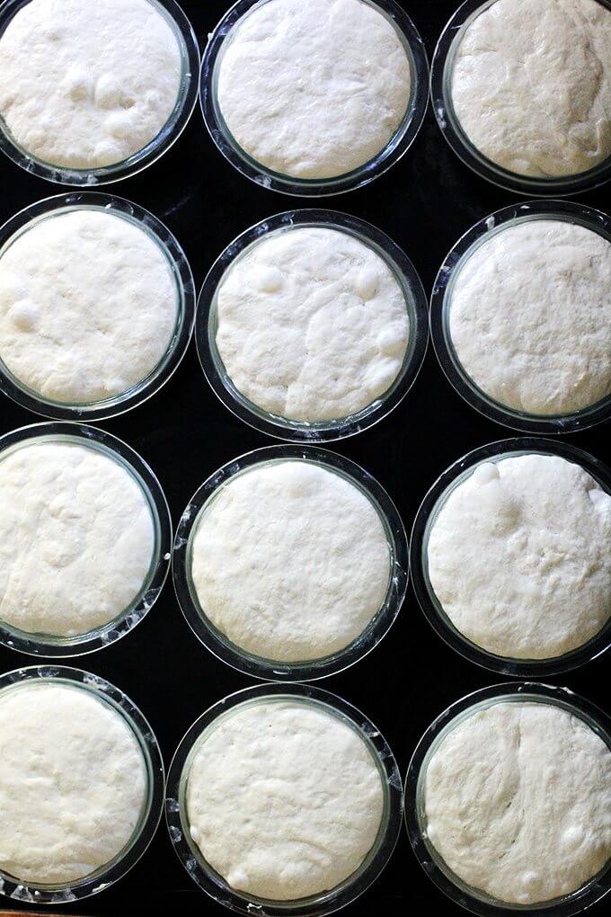 - Using your two forks and working from the center out, separate the dough into two equal pieces. Use the forks to lift each half of the dough into a prepared bowl. If the dough is too wet to transfer with forks, lightly grease your hands with butter or oil, then transfer each half to a bowl. Do not cover the bowls. Let the dough rise on the countertop near the oven (or another warm, draft-free spot) for 10 to 20 minutes, until the top of the dough just crowns the rims of the bowls.