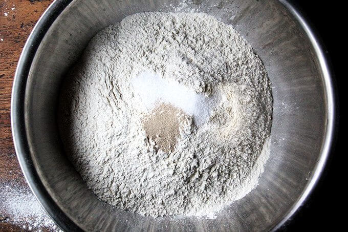 - In a large bowl, whisk together the flour, salt, sugar, and instant yeast. Add the water. Using a rubber spatula, mix until the water is absorbed and the ingredients form a sticky dough ball.