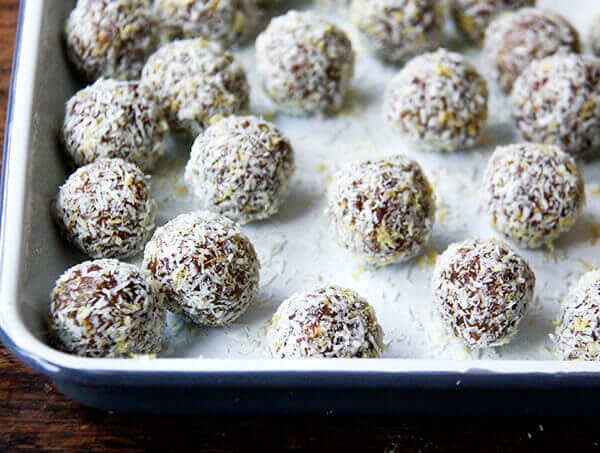 - Roll the mixture into approximately 25 to 30 small balls—I use a #100 scoop for this—then roll through the lemon zest mixture to coat. Place on a plate, and transfer to the freezer for 5 minutes to harden. Then transfer to an airtight container for storage in the refrigerator or freezer—I store in the freezer in a quart container.