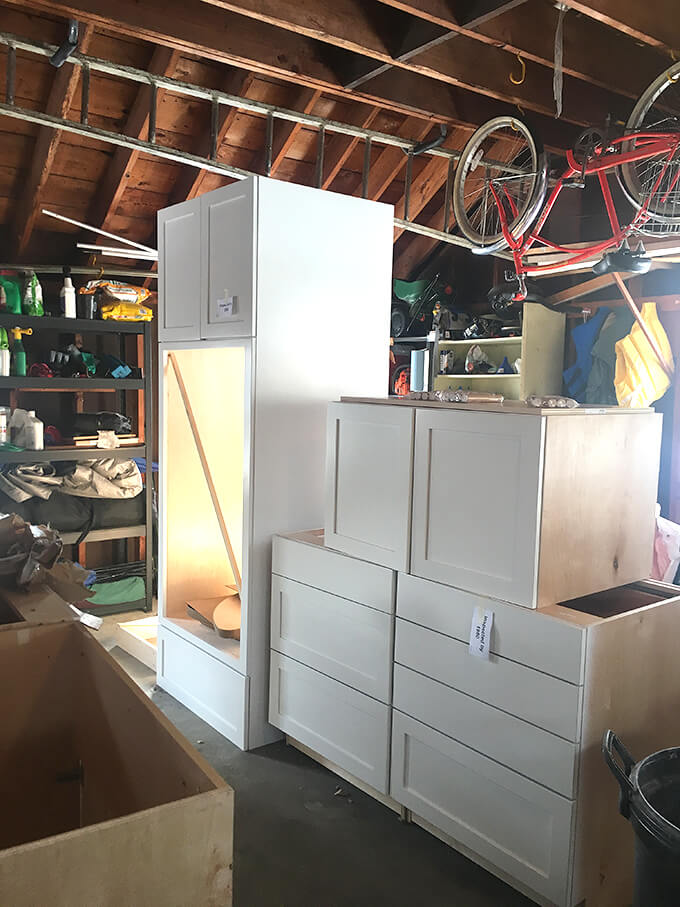 Staging the cabinet setup in the garage: