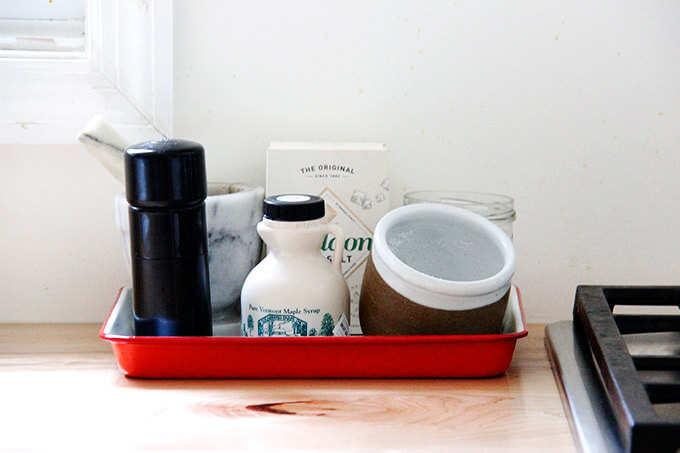 I read about Falcon Enamelware trays in one of the Remodelista books, and I thought they might be nice to organize all of the various jars and condiments I keep out on the counter. I absolutely love them.