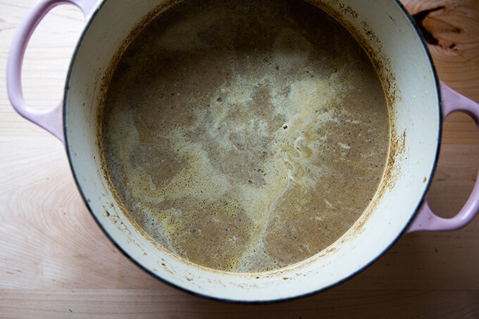 When I am very organized, I make a double batch of this vegetable stock and freeze it to have on hand as needed. Otherwise, I use water without thinking twice—well-salted water is a perfectly fine substitute for stock.