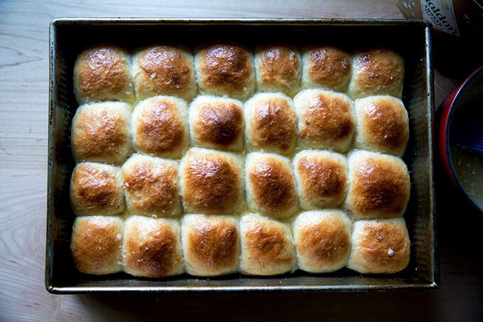 As I said, you can do this with any bread recipe you love, but if you don’t have one in mind, I have a thought: buttermilk pull-apart rolls. This is a recipe from Bread Toast Crumbs, my cookbook, and I made it recently with one small change: instead of splitting the dough and baking the rolls in two pans, I fit all 12 (or 24) rolls in one 9×13-inch baking pan.