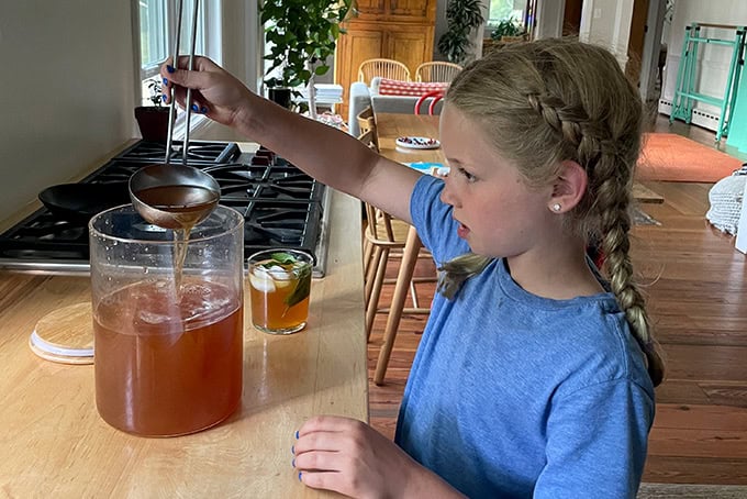 This past Monday, I made the iced tea with Tig, who, one week into summer break, already seems bored. I enlisted her to squeeze the lemons and sent her out back to cut some mint, the only herb I can’t kill. Twenty minutes later, the tea was done, chilling in the fridge, and about an hour later, we were ladling it into ice-filled glasses and relishing its quenching abilities.